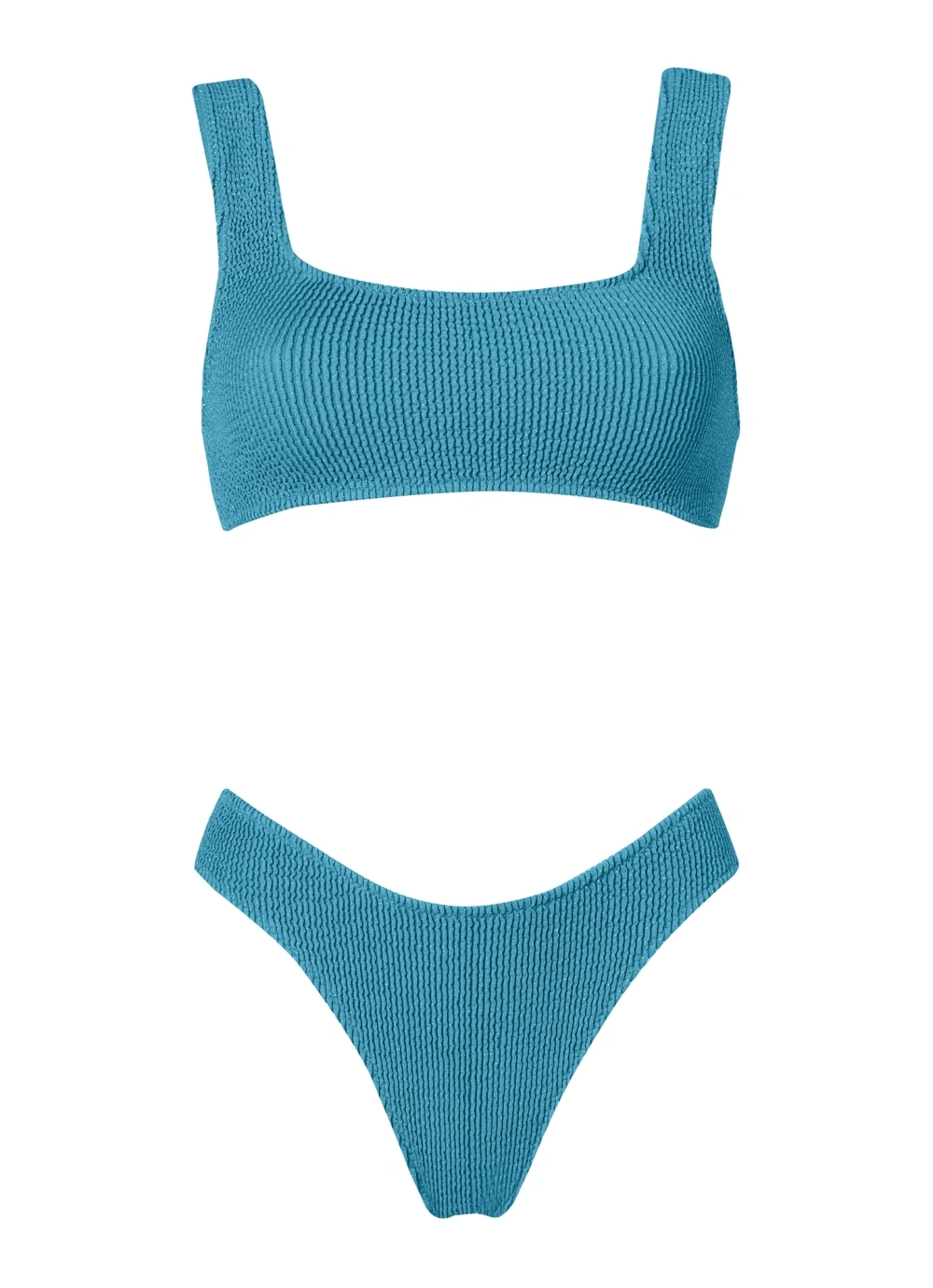 High-rise bikini in seersucker fabric with squared neck. Free from wiring or padding, so you can comfortably lounge or swim in it.